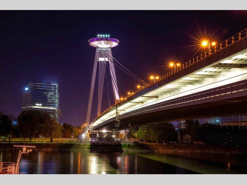 /AUTEM ZA POZNÁNÍM/ Nad Dunajem se vznáší jeden z nejikoničtějších mostů střední Evropy – Most Slovenského národného povstania v Bratislavě. Dominantou stavby je futuristická restaurace výšce 85 metrů, která láká nejen na jedinečný výhled až sto kilometrů do dálky, ale také na netradiční adrenalinový zážitek. Návštěvníci se totiž mohou s instruktorem vydat přímo na okenní římsu vyhlídkové věže a projít se vysoko nad zemí kolem všech šedesáti oken.