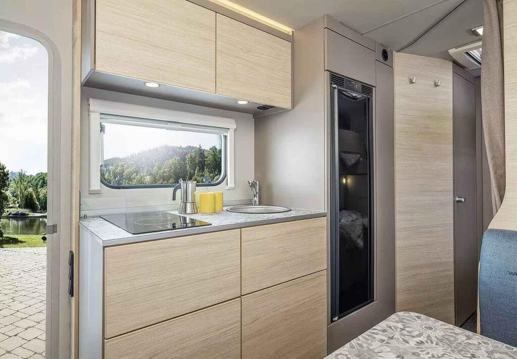 Vedle ve střední části je menší kuchyňský kout vytvořený pro základní vaření. Podle Autoevolution má pracovní deska jen omezený prostor. Naopak opět je zde dostatek nově provedených úložných míst, včetně lednice s malým mrazákem o celkovém objemu 133 litrů.
