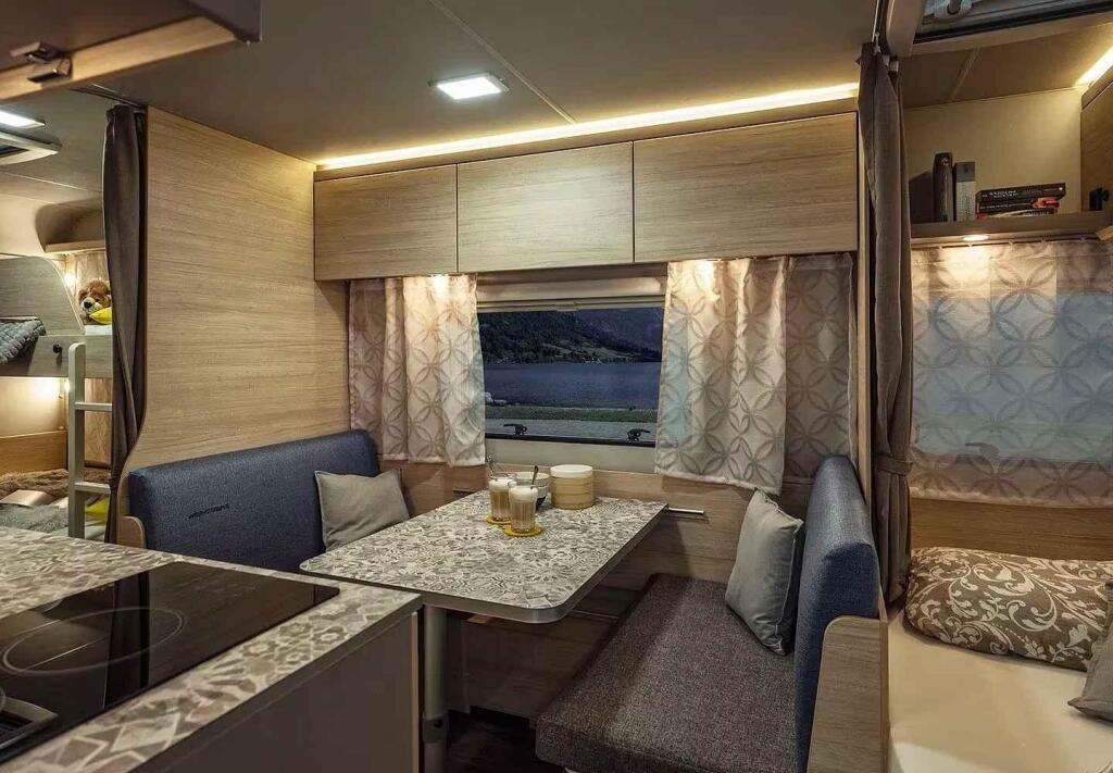 Na straně řidiče se nachází kuchyňský kout. Jídelní stůl je možné přeměnit na postel, na kterou se vleze jeden dospělý nebo dvě děti. Čelo přívěsu patří větší posteli pro dva lidi schované v případě nutnosti za závěsem. Nad ní jsou další skříňky.